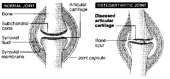 Deterioration of this articular cartilage and resulting abnormalities in the surrounding bone cause the stiffness, pain, crackling sounds and sometimes swelling of joints that are the hallmarks of osteoarthritis, the wear-and-tear form of arthritis that afflicts 16 million Americans.