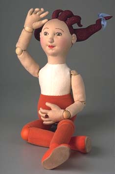 I work in cloth, using soft sculpture techniques, with a cotton knit "skin." I generally use wooden ball joints in the knees, shoulders, elbows, and wrists, with wires in the fingers so the dolls can be posed in different positions. They are stuffed with wool, which I believe gives them a natural warmth. My cloth-constructed, stuffed hair has become a personal signature feature of most of my pieces. This technique allows for more creativity in designing hair styles, and adds an element of pattern and color that compliments the costuming.